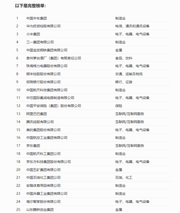 10月26日,《財富》(中文版)發(fā)布“最受贊賞的中國公司”榜單,前10名分別是中國中車集團(tuán)、華為投資控股有限公司、小米集團(tuán)、三一集團(tuán)有限公司、中國寶武鋼鐵集團(tuán)有限公司、貴州茅臺酒廠(集團(tuán))有限責(zé)任公司、珠海格力電器股份有限公司、順豐控股股份有限公司、招商銀行股份有限公司、中國航天科技集團(tuán)有限公司。